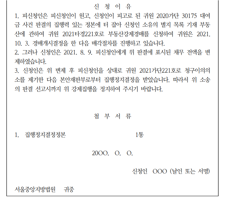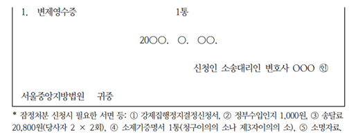 *잠정처분 신청시 필요한 서면 등:① 강제집행정지결정신청서, ② 정부수입인지 1,000원, ③ 송달료 14,800원(당사자 2✕2회), ④ 소제기증명서 1통(청구이의의 소나 제3자이의의 소), ⑤ 소명자료.