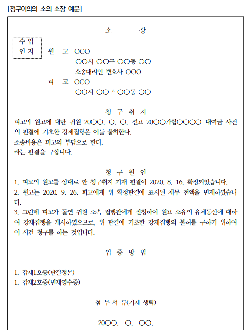 그 후 본안에서 승소하여 받은 판결정본[이때 판결주문은 “피고의 원고에 대한 ○○법원 2014. . . 선고 2014가합○○○ 대여금사건의 판결에 기초한 강제집행은 이를 불허한다” 또는 “…판결에 기초한 강제집행은 2016. 12. 31.까지(또는, 금 ○○원을 넘는 부분에 관하여) 이를 불허한다”는 형식이 된다]을 같은 법 49조 1호의 서류로 집행법원에 제출하면 된다.