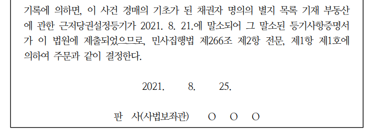 [보정명령 예시] : 이 사건 경매절차 취소사유가 발생된 것으로 보이므로 소명자료(판결문 정본, 확정증명원 등)를 첨부하여 경매절차 취소신청을 하시기 바랍니다.