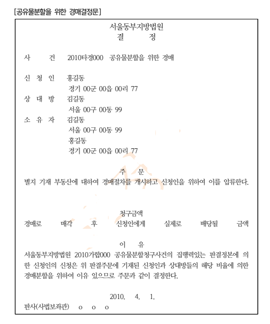 ⑻ 협의의 형식적 경매에 있어서도 어떤 종류의 서류라도 경매신청권의 존재를 증명할 수 있는 것이면 충분하나, 다만 법원의 판결 또는 심판에 의하여 형식적 경매의 신청권이 생기거나(예를 들어, 민법 제269조에 의한 공유물분할을 위한 경매 또는 민법 제1013조에 의한 상속재산의 분할을 위한 경매) 또는 형식적 경매의 신청에 법원의 허가를 요하는 경우(예를 들어, 민법 제490조에 따른 자조매각)에는 각 그 판결(공유물의 경매분할을 명한 판결의 당사자는 원고이든 피고이든 그 판결에 기한 공유물의 경매를 신청할 권리가 있다 함은 대법원 1979. 3. 8.자 79마5 결정, 등기예규 1383호 참조)이나 심판 또는 허가결정의 등본을 첨부할 필요가 있다. 공유물의 경매분할을 명한 판결의 사실심 변론종결 후 일부 공유지분의 이전등기를 마친 제3자는 위 판결에 승계집행문을 부여받아 형식적 경매신청을 할 수 있다는 것이 다수의 실무례이다.
