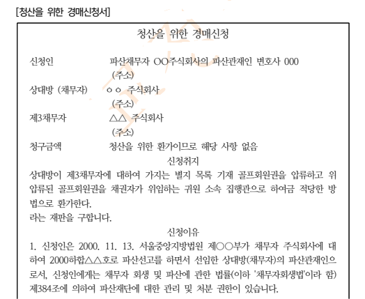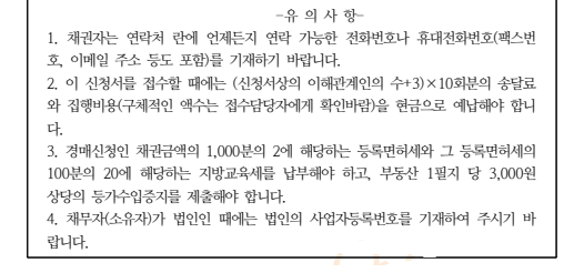 ⑵ 이 때 형식적 경매의 성격을 반영하여 경우에 따라서는 신청서의 기재사항 중 채권자·채무자·소유자는 신청인·상대방으로, 담보권과 피담보채권의 표시는 경매신청권의 표시 등으로 바꾸어 기재하여야 할 경우가 있을 것이다.