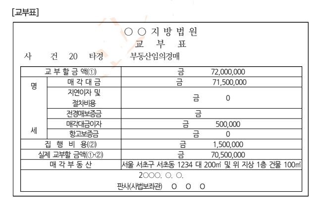 ⑷ 다만 신청인에 대한 매각대금의 교부만 있는 경우에는 굳이 배당표를 작성할 필요가 없다고도 할 수 있으나, 실무상으로는 매각대금과 집행비용 및 교부한 매각대금을 명확히 하기 위하여 강제경매 또는 담보권 실행을 위한 경매시의 배당표를 다음과 같이 수정하여 활용함이 무난하다.
