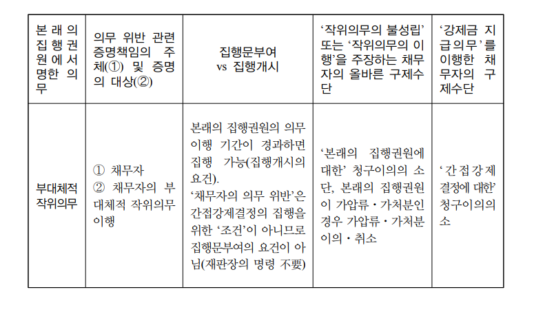 ② 판례는 ‘부대체적 작위의무’의 간접강제에서 ‘의무의 불이행’은 집행문부여에 재판장의 명령을 요하는 ‘집행의 조건’에 해당하지 않는다고 보는 것으로 생각된다(대법원 2013. 2. 14. 선고 2012다26398 판결 참조).