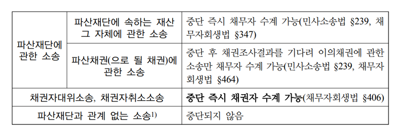 ② 변론종결 후에 중단사유가 생긴 때에는 소송수계절차 없이 판결을 선고할 수 있으며 소송대리인의 유무에 관계없이 종전의 당사자를 그대로 표시하면 된다(대법원 1989. 9. 26. 선고 87므13). 대법원에서 상고이유서 제출기간이 경과한 후에 소송당사자가 파산선고를 받은 때에도 상고법원은 상고장, 상고이유서, 답변서, 그 밖의 소송기록에 의하여 상고가 이유 있다고 인정할 경우에 파산법에 정해진 수계절차를 거치지 않고 변론 없이 원심판결을 파기하고 사건을 원심법원에 환송하는 판결을 할 수 있다(대법원 2001. 6. 26. 선고 2000다44928 판결).
