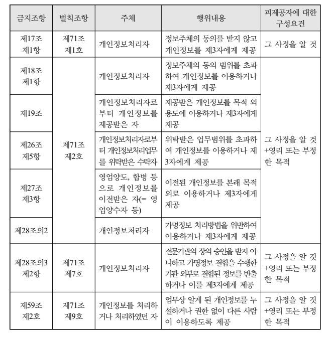 개인정보 보호법은 다른 입법례에서 찾기 어려울 만큼 광범위하고 강력한 형사처벌을 두고 있는 것이 특징이다. 개인정보의 제공 등과 관련된 형사처벌 조항은 아래 표와 같이 ㈎ 대향범의 구조로 처벌하는 규정, ㈏, ㈐ 일방만 처벌하는 규정으로 구성된다(이하 표는 현행법을 기준으로 한다).