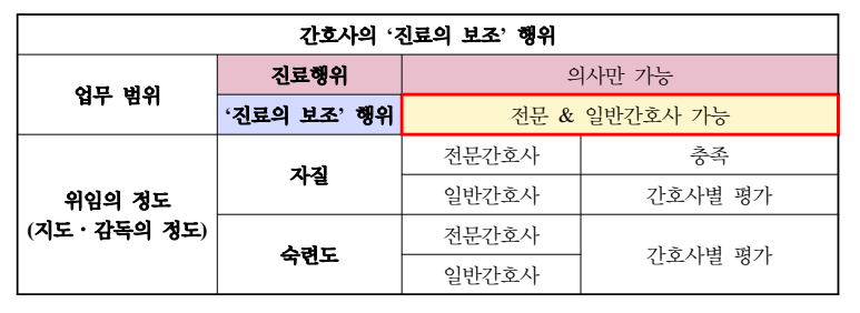 ㈎ 간호사의 업무를 구별하는 기준으로는, 절대적 업무인 요양상 간호를 ① 절대적 간호행위, 진료의 보조가 불가능한 경우를 ② 절대적 의료행위[자궁질도말세포병리검사를 위한 검체 채취(대법원 2005도5579), 건강검진(대법원 2010도5964), 사망진단(대법원 2017도10007), 진찰․처방(대법원 2006도2306), 마취전문 간호사의 척추 마취시술(대법원 2008도590), 메조 테라피 주사, 모낭주사 등(대법원 2019도3890), 수술용 스테인리스 관 삽입, 간호조무사의 수술용 시멘트 배합 및 주입 등 행위(대법원 2020도12568)]로 보고, 진료의 보조가 가능한 경우에서 의사의 구체적 지시를 요하는 ③-1) 상대적 의료행위[양막 파열시술(대법원 2010도2755) 염화칼륨 혈관주사(대법원 81다413)], 의사의 구체적 지시를 요하지 않는 ③-2) 상대적 간호행위[활력징후 측정, 정맥주사(Side Injection), 피내주사, 피하주사, 근육주사, 간호조무사의 물사마귀 제거행위 (대법원 2019도7082), 간호조무사가 큐렛으로 물사마귀를 제거, 카테터 제거행위(대법원 2022도3209, 대법원 2023도5114), 실밥 제거(대법원 2022도3449)]로 나누는 견해가 있다. 이 견해에 의하면, 의사가 직접 시행하지 않으면 보건위생상 위해를 가할 수 있는 행위를 절대적 의료행위로 구분할 수 있다. 한편 간호사의 업무를 위임이 불가능한 업무, 의존적 업무, 약한 상호의존적 업무, 동등한 상호의존적 업무, 강한 상호의존적 업무, 간호사의 독자적 업무로 구분하는 견해도 존재한다.