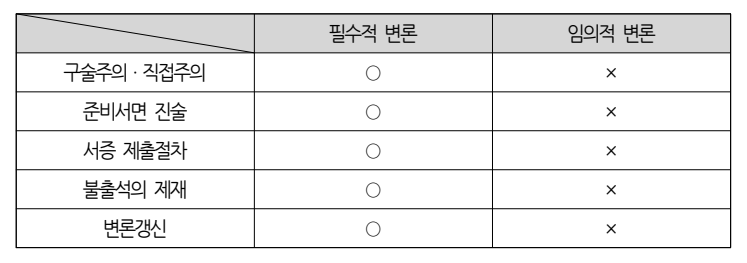 필수적 변론과 임의적 변론을 비교하면 다음 표와 같다.