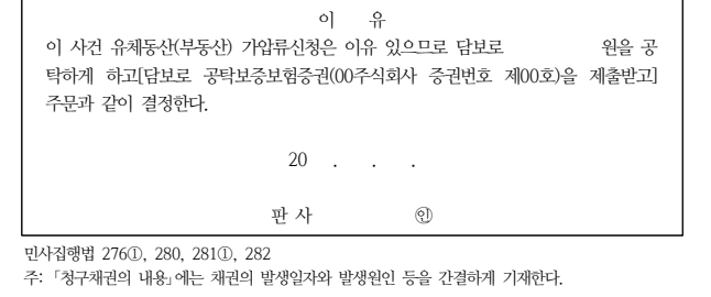 가압류명령을 발령할 때에는 결정의 형식으로 하여야 하며, 다음 사항은 반드시 기재해야 한다.