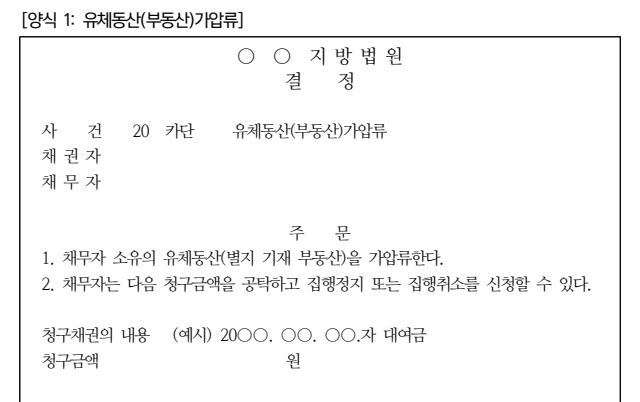 ⑶ 실무상으로도 가압류를 부동산가압류, 채권가압류, 유체동산가압류의 세 가지로 구분하여 채권자가 동일채권을 위하여 동일 채무자 소유의 부동산, 채권, 유체동산을 가압류할 때에는 각각 별개의 사건으로서 1개의 가압류신청을 하는 것이 대부분이고, 가압류법원이 동시에 집행기관이 되지 않는 유체동산가압류의 경우를 제외하고는 예외 없이 신청서에 목적물까지도 표시하고 있으며, 법원도 이를 가압류명령 중에 기재하고 있으므로, 가압류를 신청할 때에는 집행의 목적물을 표시하여야 한다.