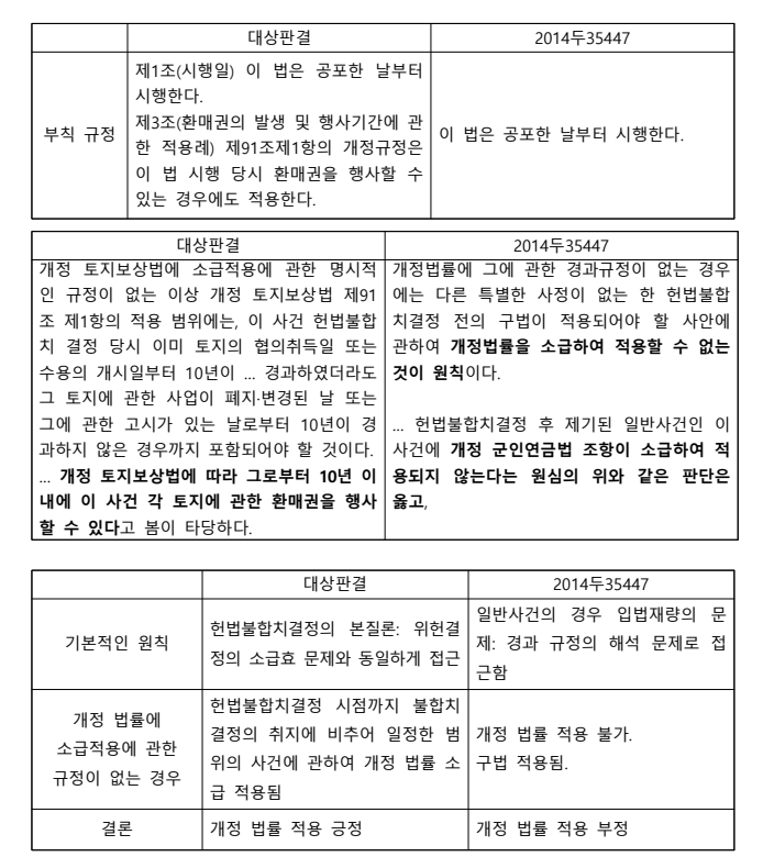 ㈐ 그러나 적용중지형 헌법불합치결정과 그에 따른 개선입법이 이루어진 경우 헌법불합치결정 당시 법원에 제소되지 아니한 일반사건에 관하여 개선입법이 적용될 수 있는지가 쟁점이라는 점에서 대상판결과 2014두35447 판결은 공통적임