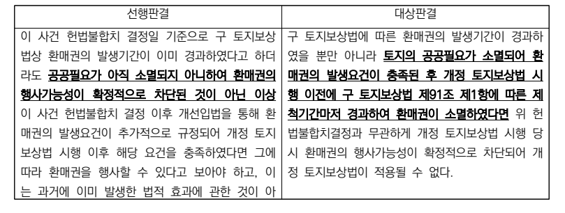 ⑴ 위 판결의 쟁점은, 구 토지보상법 제91조 제1항에 대한 헌법불합치 결정 이전에 환매권 발생기간이 경과하였으나 개정 토지보상법 이후 환매권 발생요건이 충족된 경우 개정 토지보상법 제91조 제1항의 적용을 통한 환매권 발생 여부(적극)이다.