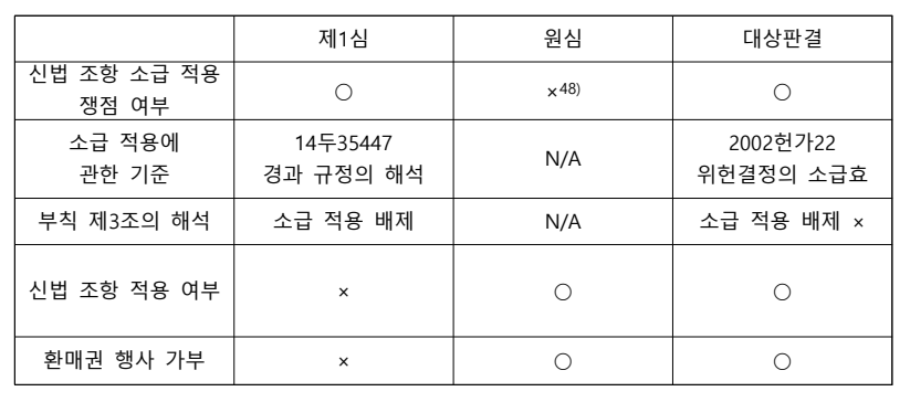 - 판례는 당해사건과 병행사건에 관하여는 헌법불합치결정의 취지나 위헌심판에서의 구체적 규범통제의 실효성 보장이라는 관점에서 경과 규정의 해석 여하와 무관하게 개선입법의 소급 적용을 긍정하고, 일반 사건에 관하여는 입법재량 존중과 그에 따른 경과규정의 해석이라는 관점에서 접근하고 있는 선례의 태도와 일치하는지는 의문임. 특히 같은 일반사건에 관한 2014두35447 판결과 정합성이 문제될 수 있음