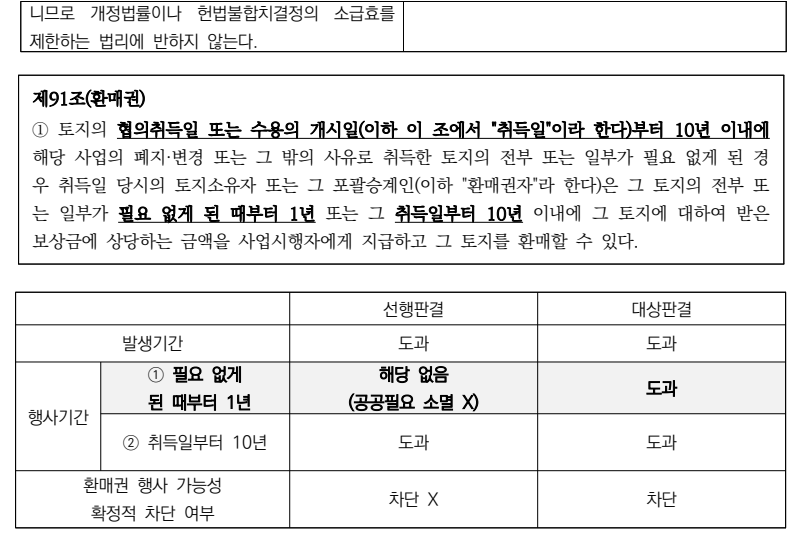 헌법재판소는 2020. 11. 26. 구 토지보상법 제91조 제1항 중 환매권 행사의 발생기 간을 제한한 ‘토지의 협의취득일 또는 수용의 개시일(이하 ‘취득일’이라고 한다)로부 터 10년 이내에’ 부분에 대하여 헌법불합치결정을 하면서 입법자가 개정할 때까지 적 용중지를 명하였다. 다만 이 사건 헌법불합치결정이 위헌으로 선언한 부분은 환매권 발생기간에 있으므로 환매권의 제척기간인 「공공필요성 소멸일로부터 1년 내」의 부분 은 여전히 유효하므로, 공공필요성이 소멸하면 그로부터 1년 내에 환매권을 행사하여 야 하였다.