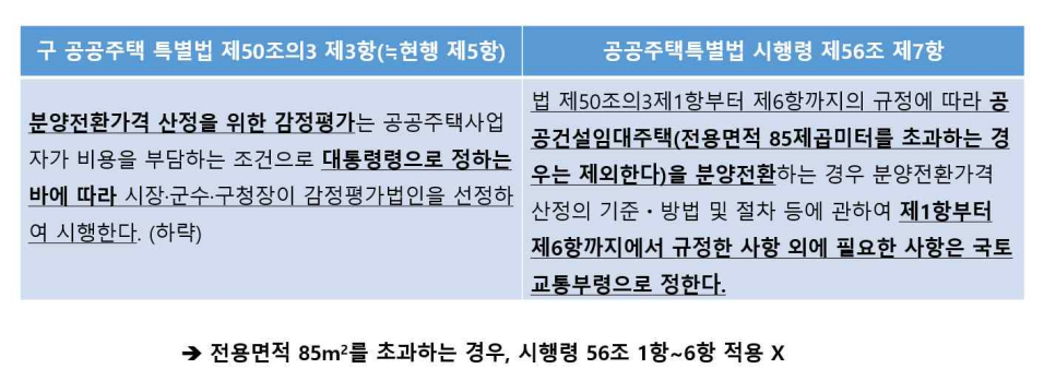 ⑵ 공공주택사업자가 전용면적 85㎡를 초과하는 공공건설임대주택을 임대의무기간이 지난 후 분양전환하는 경우에는 감정평가법인의 선정 및 감정평가에 대한 이의절차 등에 관한 구「공공주택 특별법」(2020. 12. 22. 법률 제17734호로 개정되기 전의 것, 이하 ’구「공공주택 특별법」‘이라 한다) 제50조의3 제3항 및 구「공공주택 특별법 시행령」(2021. 3. 23. 대통령령 제35149호로 개정되기 전의 것, 이하 ’구「공공주택 특별법 시행령」‘이라 한다) 제56조 제1 내지 6항이 적용되지 않는다.