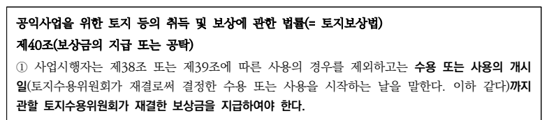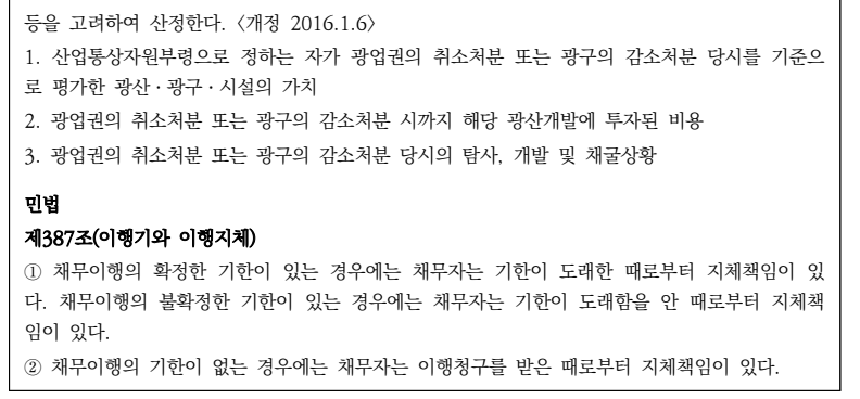 ☞ 위와 같이 토지보상법 제40조 제1항의 경우 법률이 ‘수용 또는 사용 개시일’을 이행기로 정한 것임. 따라서 이행기의 정함이 없는 경우가 아니고, 이행기가 도래하면 민법 제387조 제1항 후문에 따라 지체책임을 짐. 반면 광업법에는 위와 같은 규정이 없음