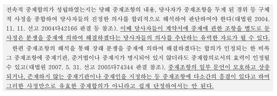 한편 중재조항의 해석을 통해 장래 분쟁을 중재에 의하여 해결하겠다는 합의가 인정되는 한 비록 그 중재조항에 중재기관, 준거법이나 중재지가 명시되어 있지 않더라도 중재합의로서의 효력이 인정될 수 있고, 중재조항의 일부 문언이 모호하고 상충되거나, 존재하지 않는 중재기관이나 중재인을 지정하는 등 중재조항에 다소간의 흠결이 있다고 하여 그러한 사정만으로 유효한 중재합의가 아니라고 쉽게 단정하여서는 안 된다.