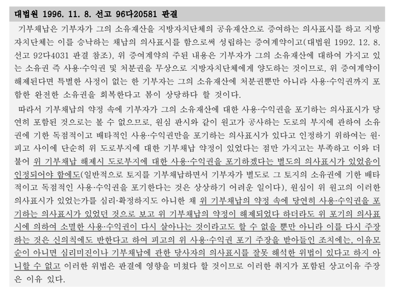 ② 대법원 1996. 11. 8. 선고 96다20581 판결이 있음. 96다20581 판결은 논리적 흐름은 대상 판결과는 다소 차이가 있을 수 있지만, 기부채납이 효력이 없거나 효력을 상실하였음에도 그와 별개로 기부채납의 약정 행위에 독점적·배타적 사용·수익권의 포기 의사표시가 포함되어 있고 기부채납의 효력과 관계 없이 그 포기의 의사표시는 여전히 유효하게 존속한다는 식의 논리를 받아들이지 않고 있는 것임