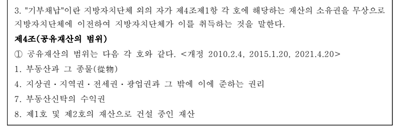 ① 기부채납은 사법상의 증여계약임. 법률상 근거로는 「공유재산 및 물품관리법」이 있음