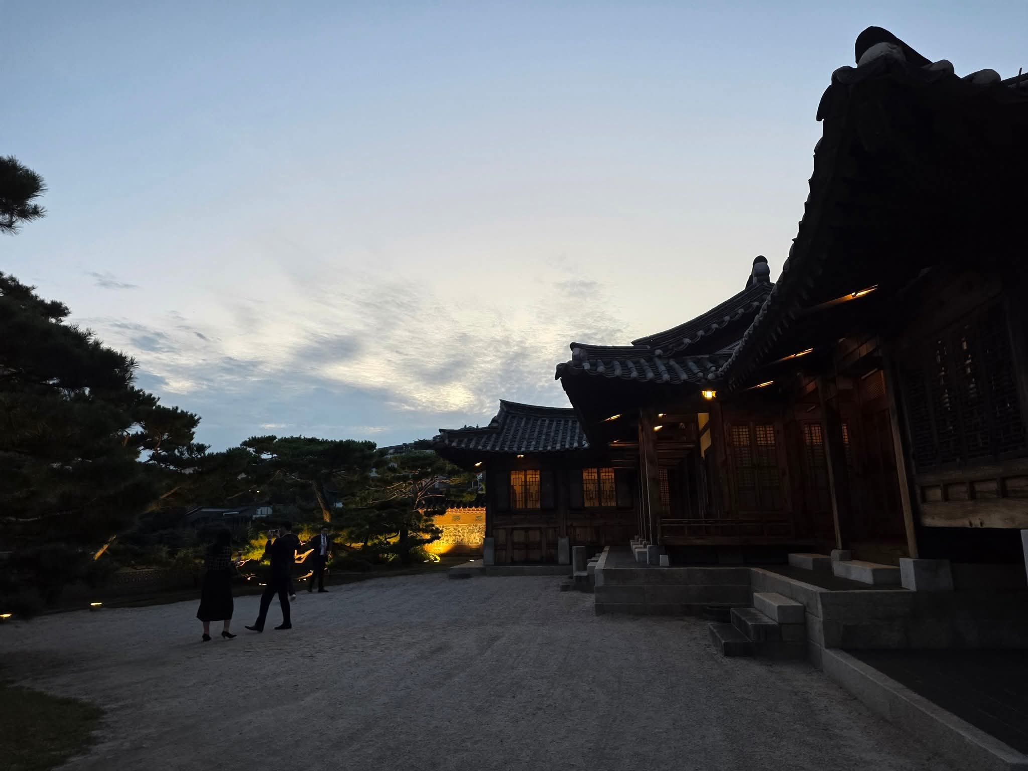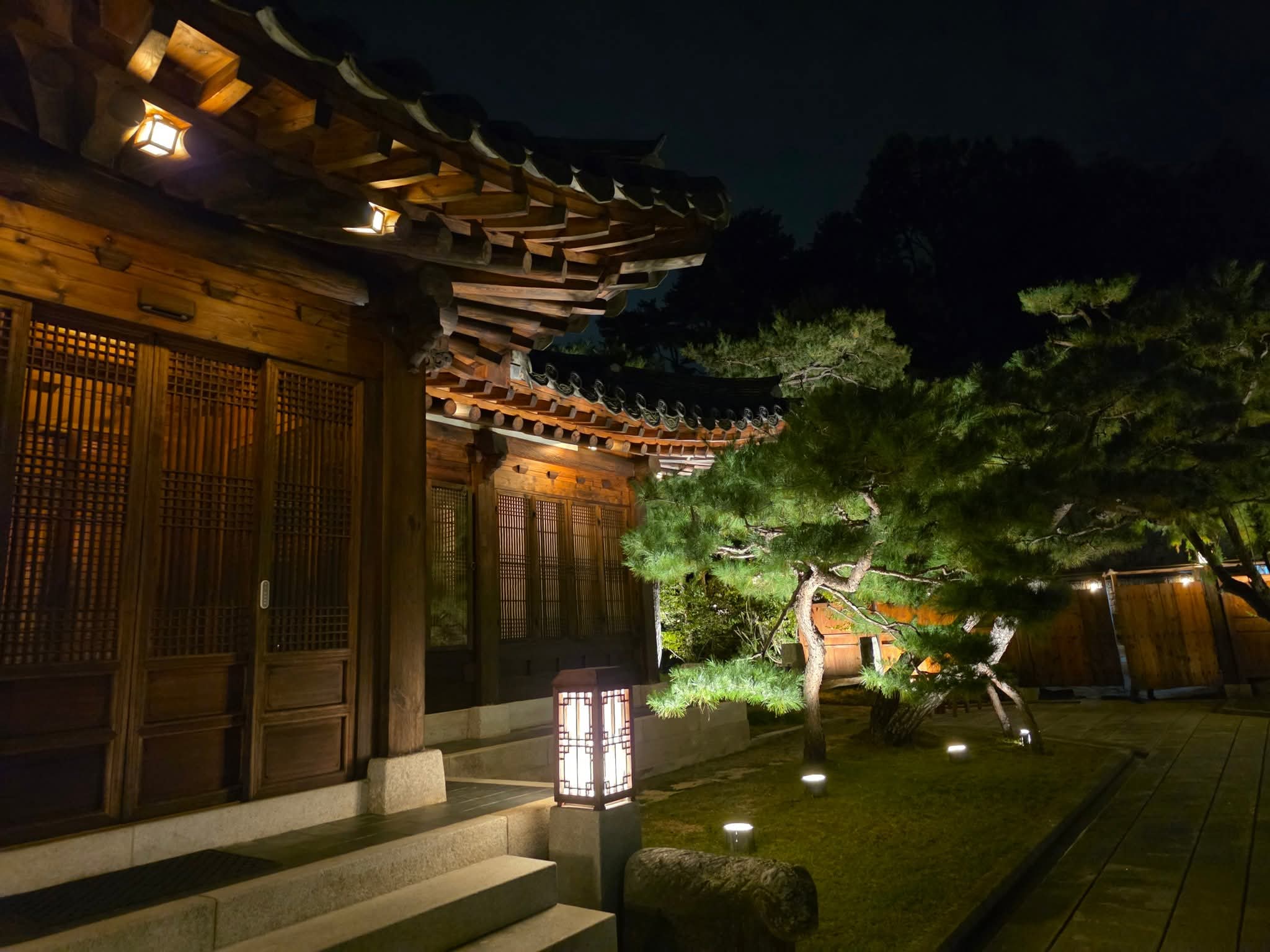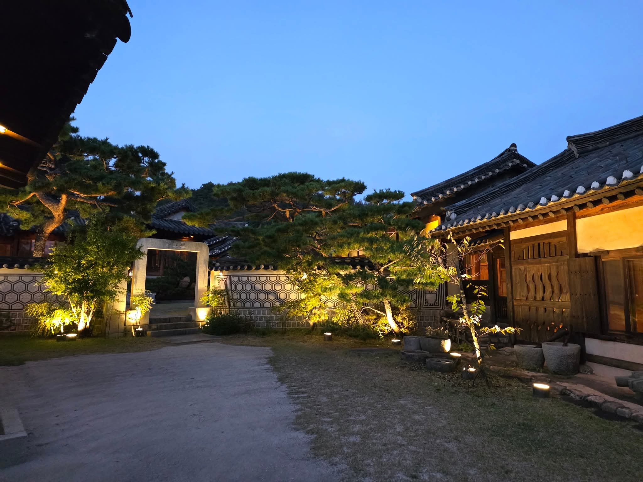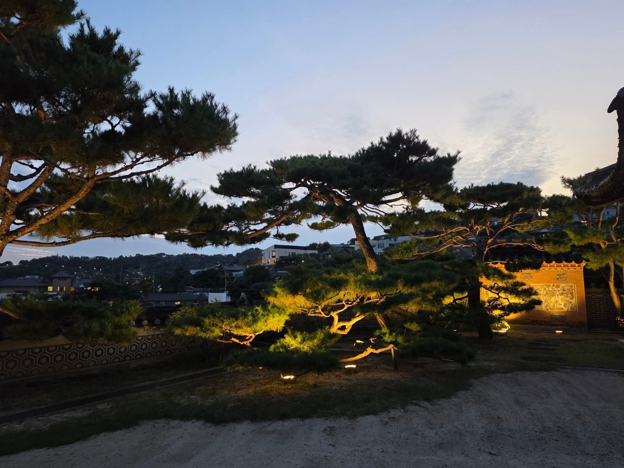 하나둘 불이 켜지기 시작한 한옥의 처마와 고요한 정원.