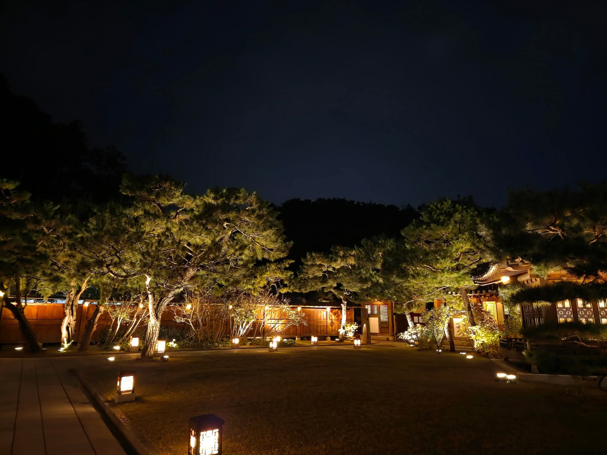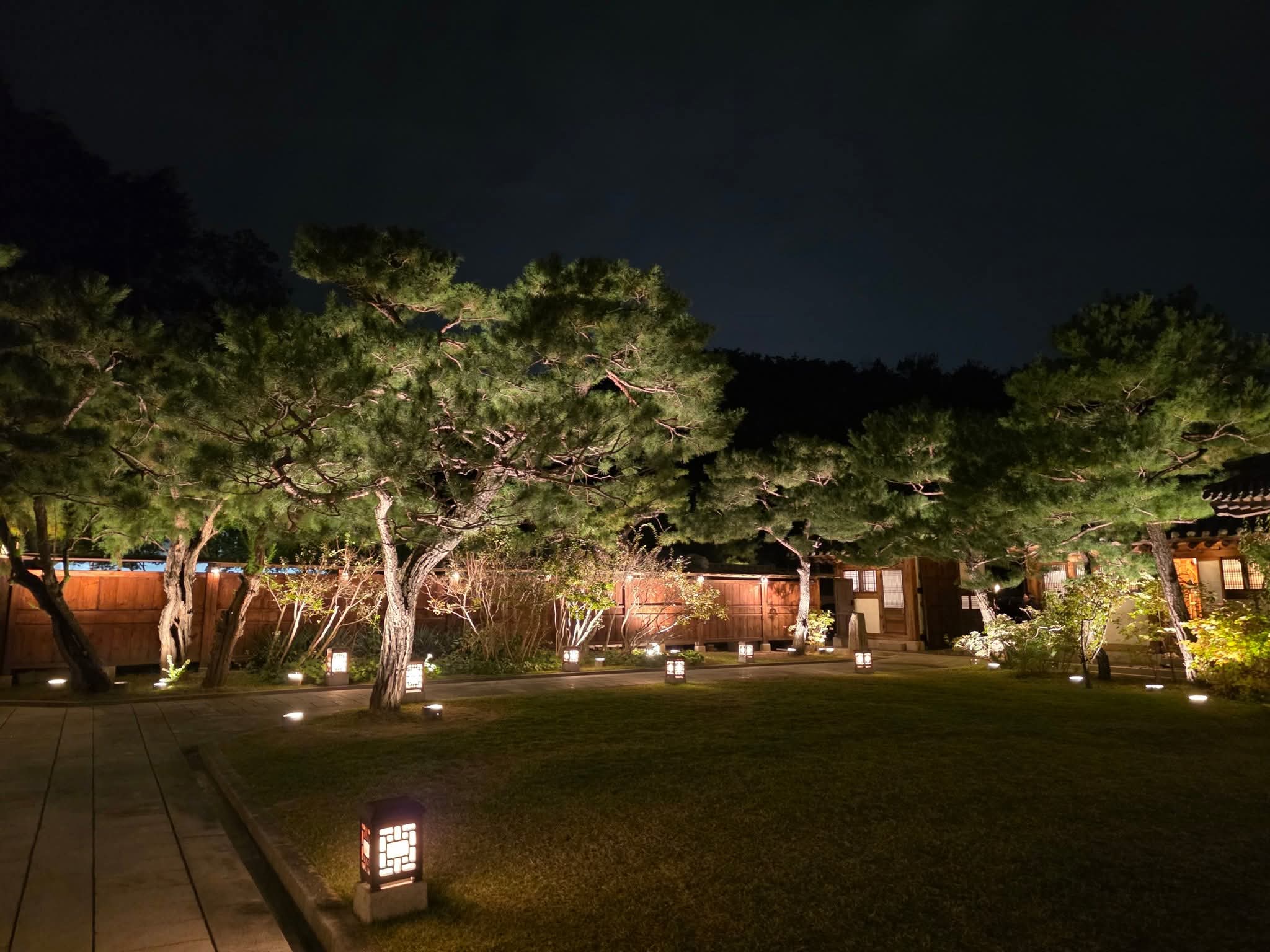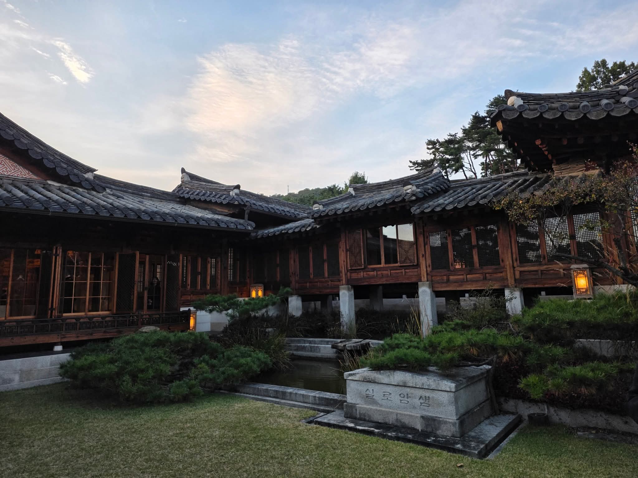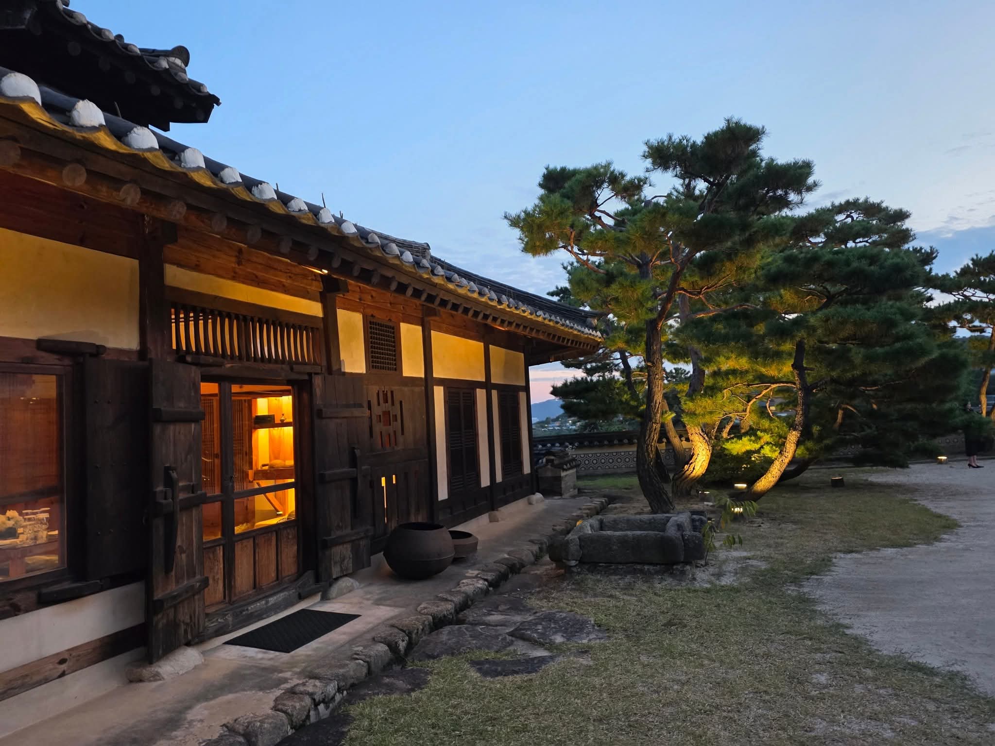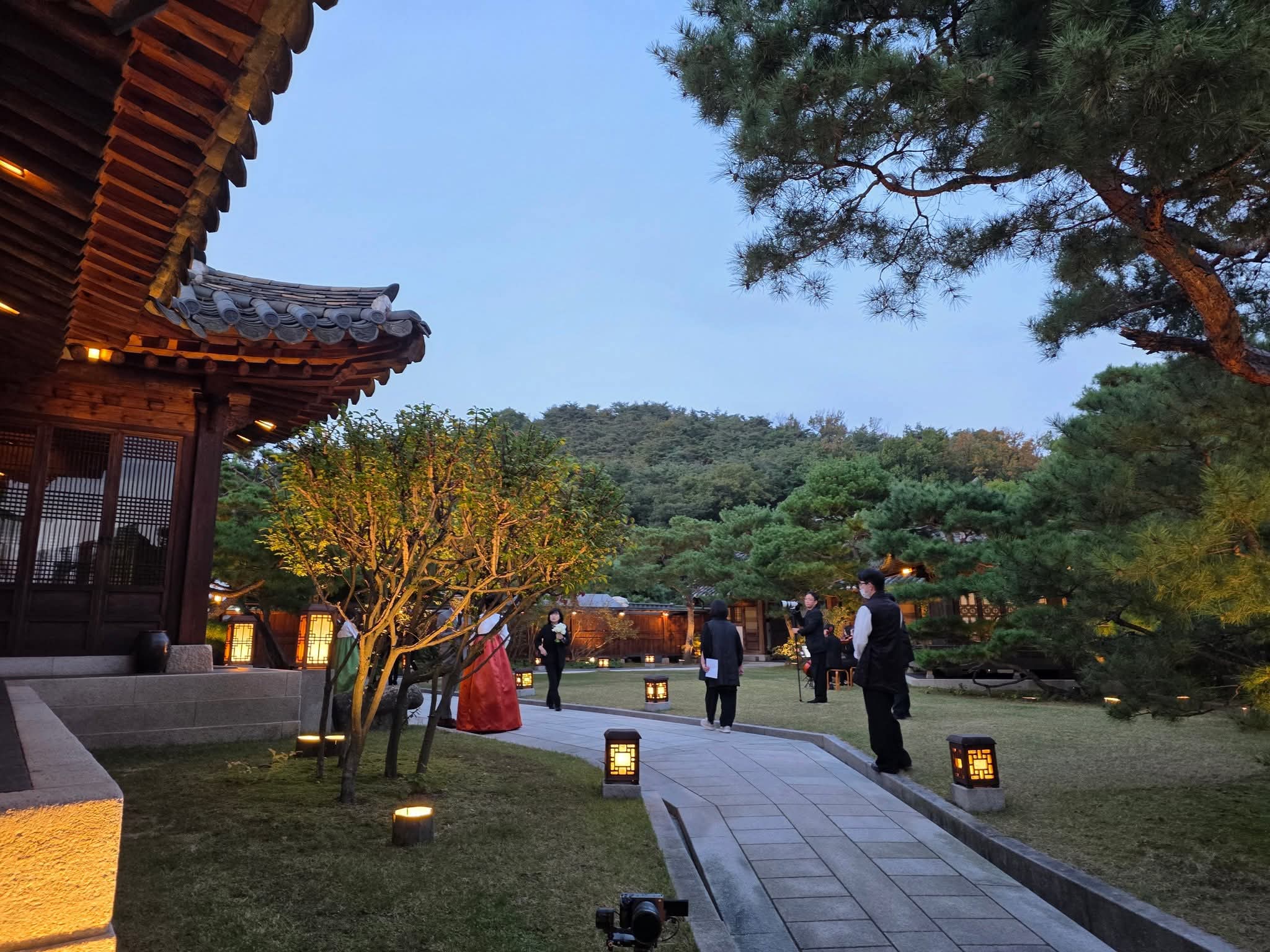 하나둘 불이 켜지기 시작한 한옥의 처마와 고요한 정원.