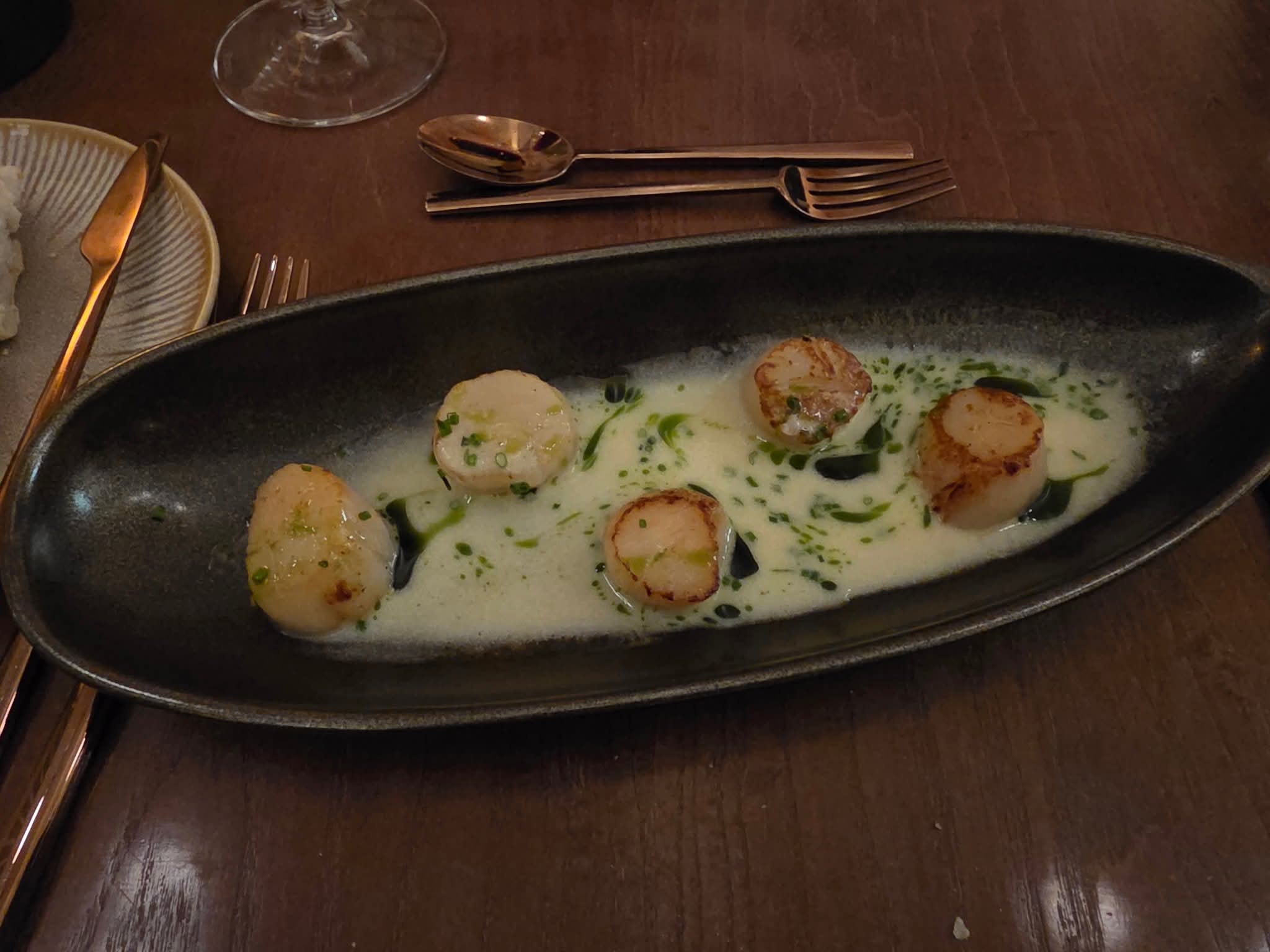 첫 번째 접시, 브레이즈드 스캘럽(관자)이다. 그것은 바다의 우아한 인사였다. 뵈르 블랑(Beurre Blanc) 소스의 진하고 고소한 버터 향이 코끝을 스치고, 입안에 넣는 순간 부드러운 관자가 혀끝에서 녹아내렸다. 바질 오일의 싱그러움은 마치 대서양에서 불어오는 산들바람처럼, 무거울 수 있는 버터의 맛을 경쾌하게 감싸 안았다. 리스본의 바다가 내어준 가장 순수한 속살을 맛보는 듯한 황홀경이었다.