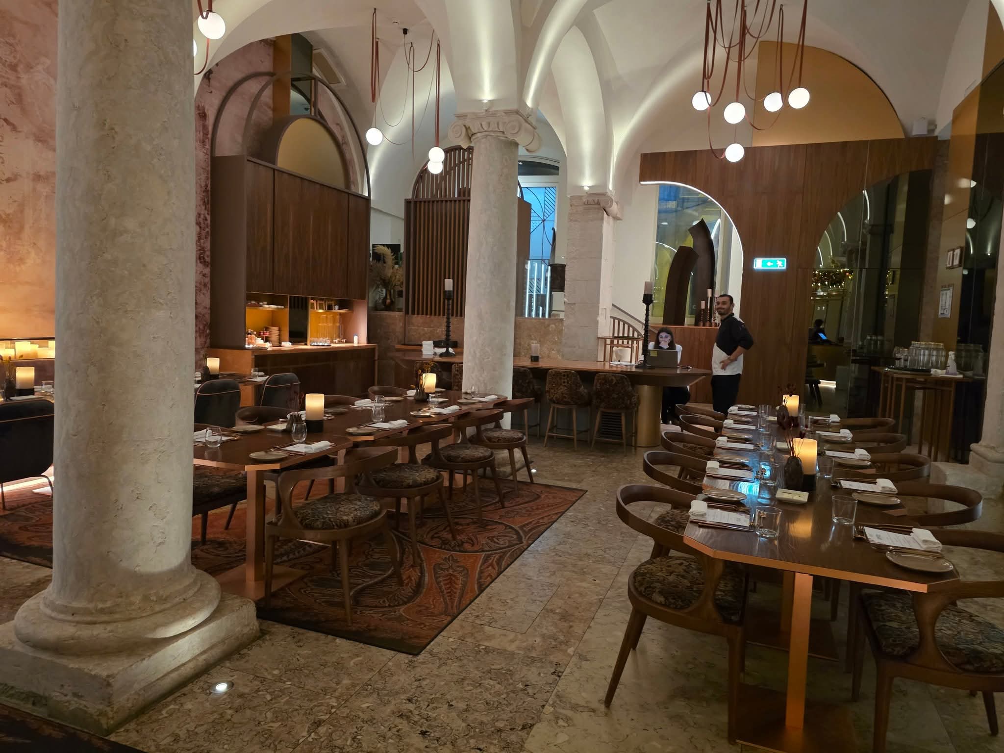 고딕 아치가 얹힌 천장 아래, 따뜻한 조명이 테이블 위로 내려앉았다.