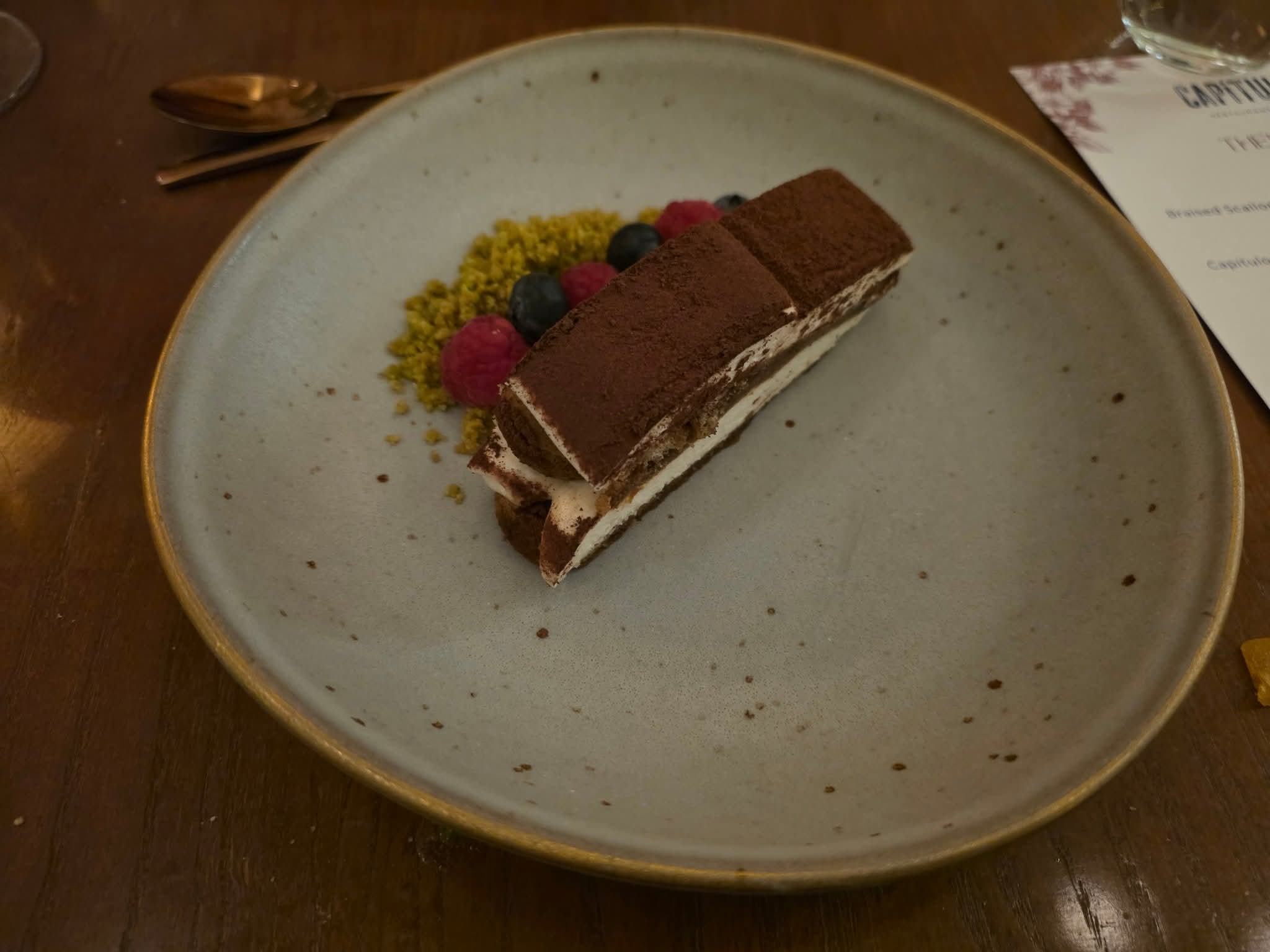마지막으로 찾아온 피스타치오 티라미수는 이 완벽한 저녁의 달콤한 마침표였다. 부드러운 마스카포네 치즈와 쌉싸름한 커피 향 사이로, 와작 씹히는 피스타치오 크럼블은 예기치 못한 즐거움이었다. 입안에서 사르르 사라지는 그 달콤함이 아쉬워, 자꾸만 스푼을 놓지 못하고 머뭇거렸다.