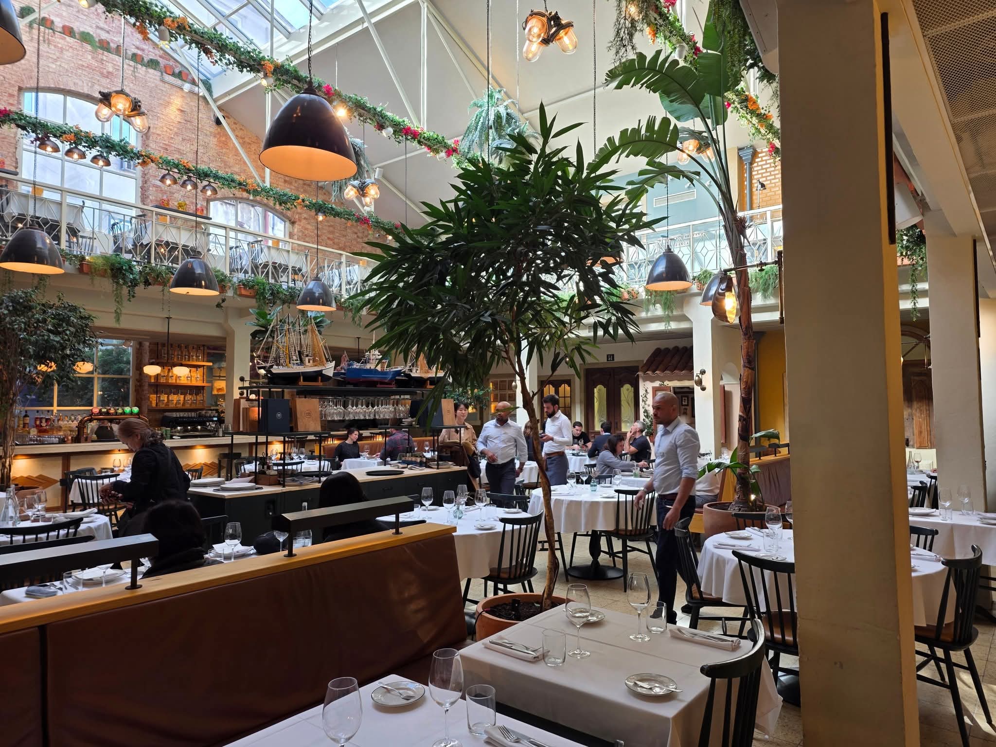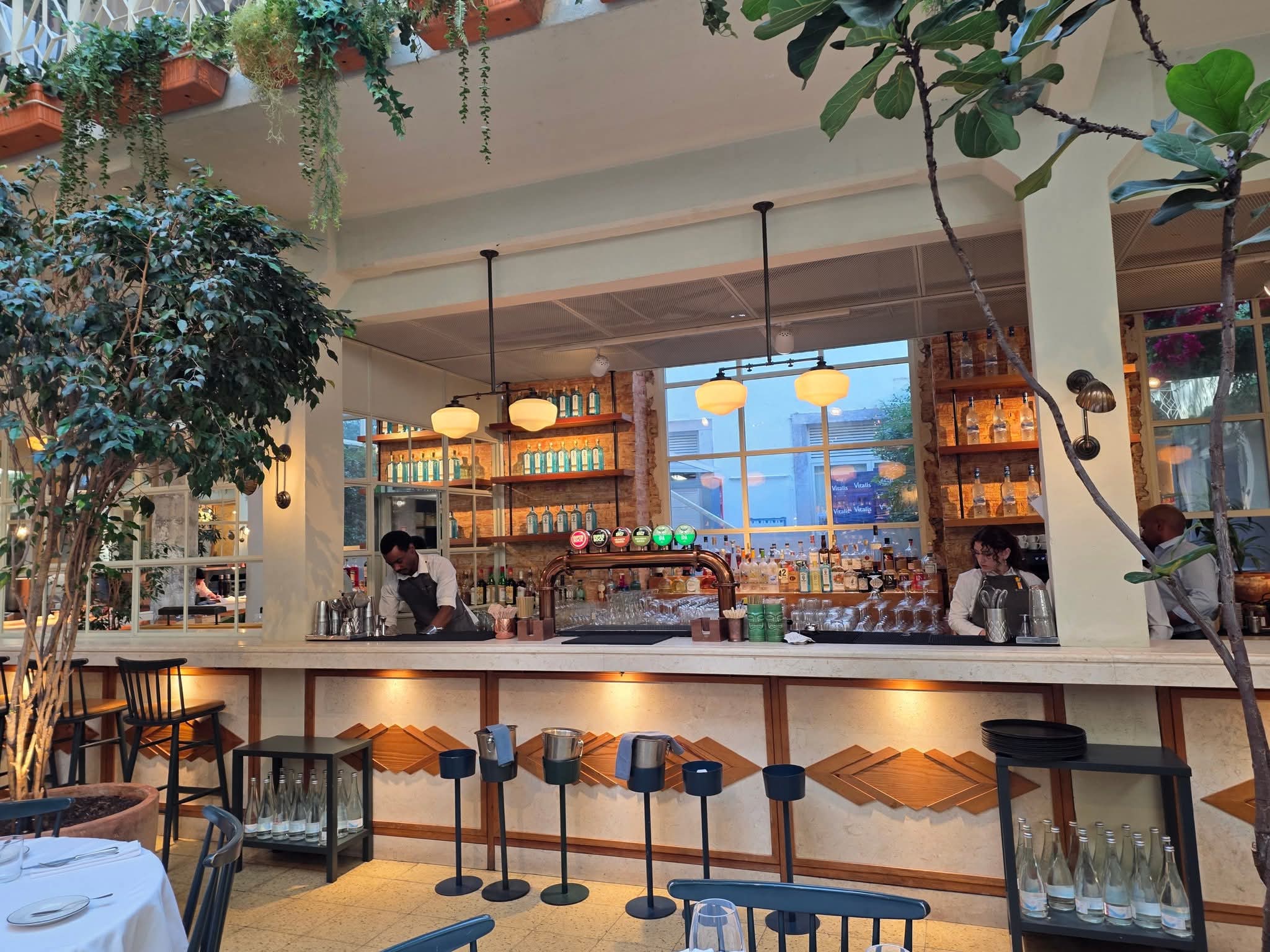 실내지만 마치 야외 온실 같은 공간. 유리 천장을 통과한 빛이 테이블 위로 포근히 내려앉는다.