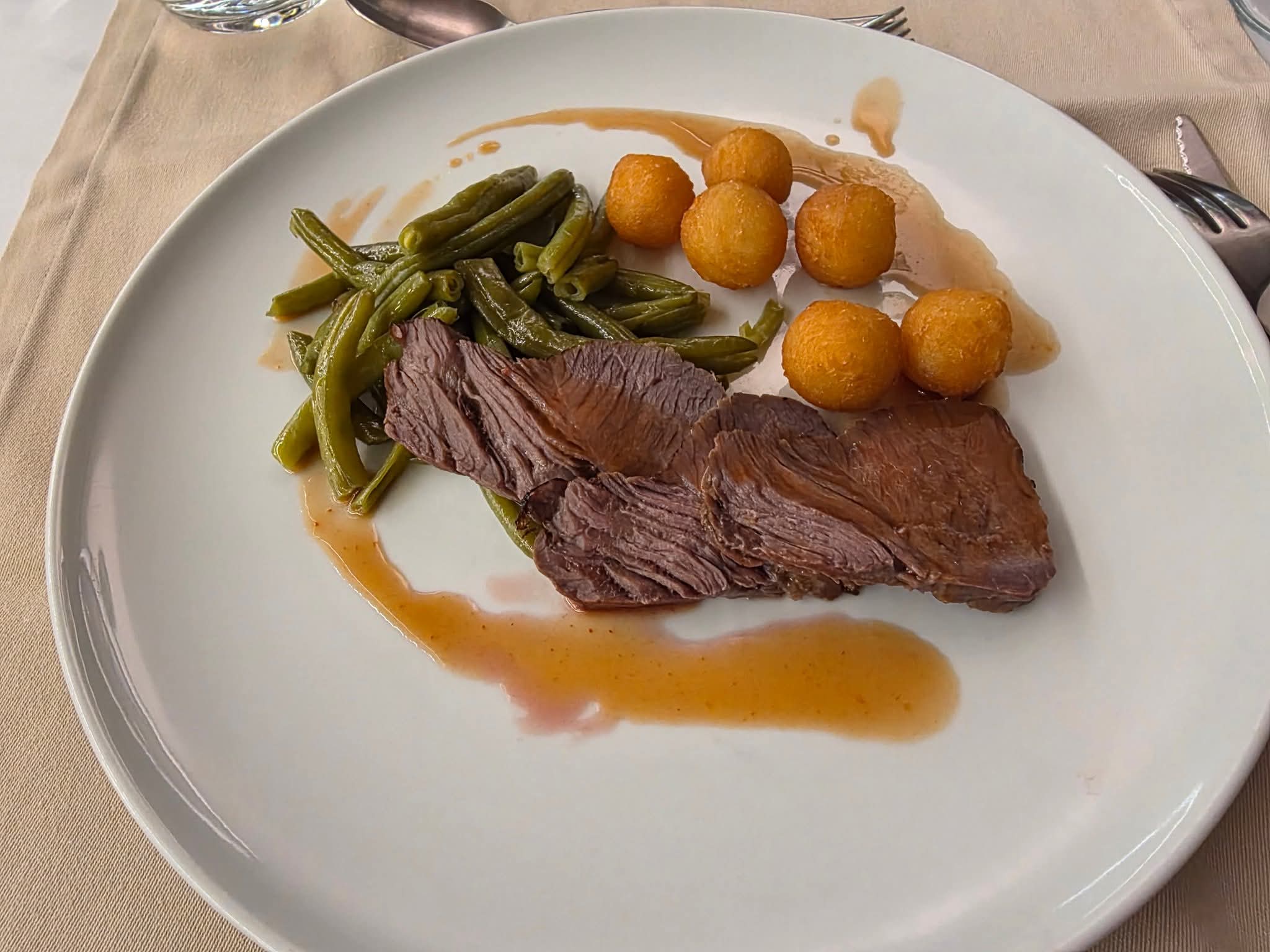 얇게 썬 송아지 고기에 그린빈(줄기콩)과 동그랗게 튀긴 감자볼(Noisette potatoes)을 곁들인 요리다.