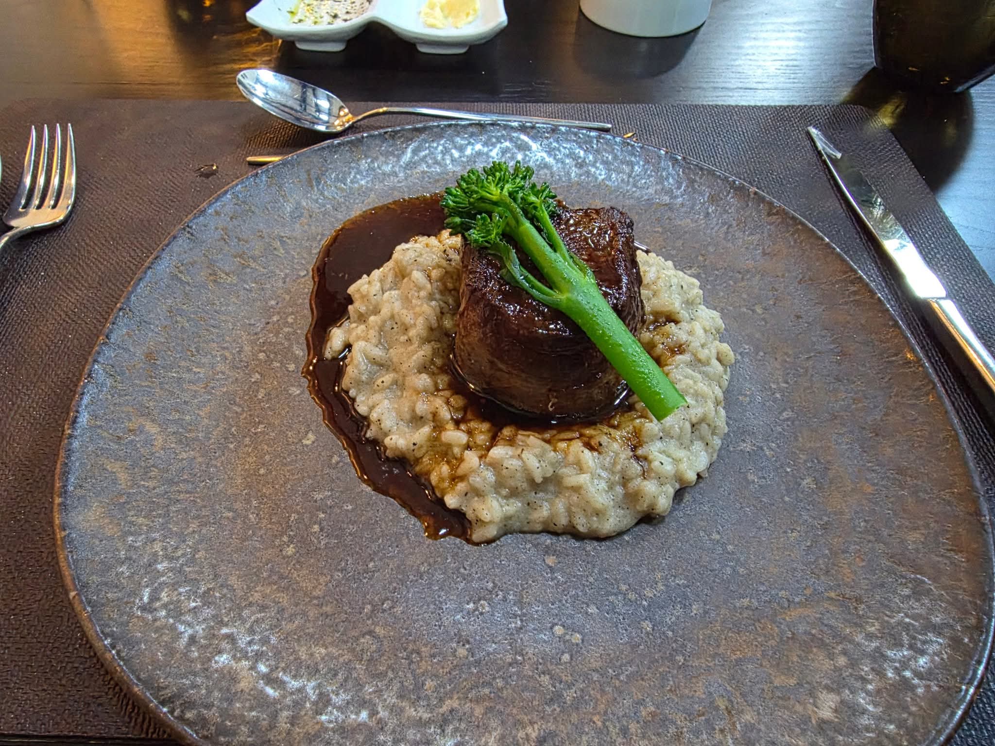 진한 풍미의 스테이크 한 점. 입안 가득 퍼지는 고기의 육즙과 부드러운 리조또를 음미한 뒤 와인을 한 모금 넘기니, 그 궁합이 기가 막혔다.