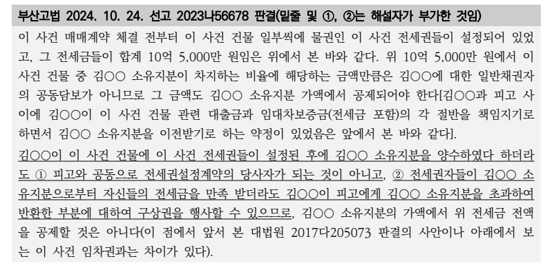 ⑴ 원심은, 건물 공유자가 공동으로 전세권을 설정한 것이 아니라 전세권이 설정되어 있는 건물의 지분을 채무자(사해행위를 한 채무자)가 이전받은 경우는 대법원 2017다205073 판결의 사안과는 달라서, 일반채권자의 공동담보에 제공되는 책임재산액을 산정할 때 전세금 전액을 공제할 것이 아니고 소유 지분 비율만큼의 전세금만 공제하여야 한다고 판단하였으나, 논리적인 설명이 명확하지 않음(부산고법 2024. 10. 24. 선고 2023나56678 판결)