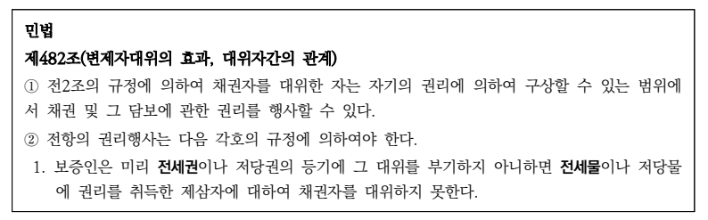 - 반면 주택임대차보호법상 우선변제권 있는 임차인의 우선변제권에 관하여는 변제자대위를 할 수 있다고 보기 어려움. 우선, 임차보증금채권의 양수인에게는 주택임대차보호법상 우선변제권이 인정되지 않는다는 판례가 있고(이 판례의 타당성에 관하여는 의문이 있음), 그 판례가 아니더라도 우선변제권 있는 임차인이 주택의 인도와 주민등록 중 어느 하나의 요건이라도 잃으면 우선변제권을 상실함
