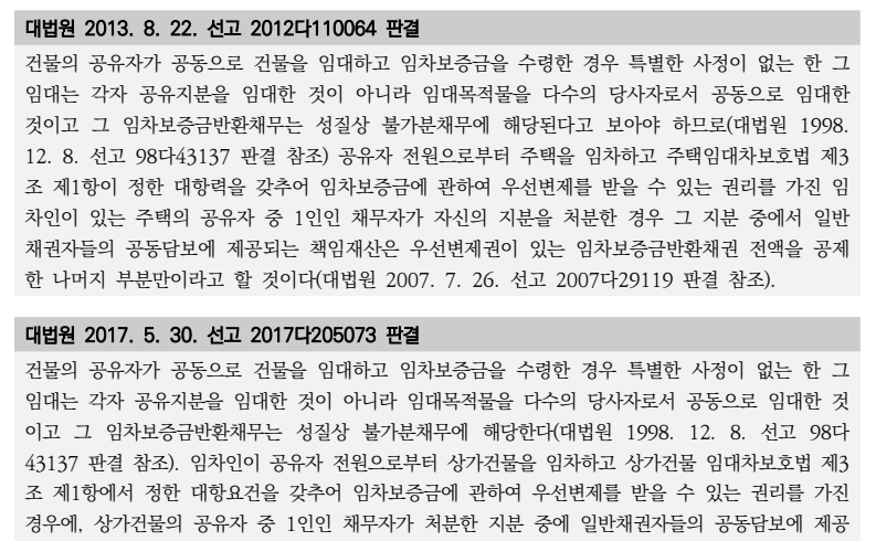 한편, 임차인이 공유자 전원으로부터 상가건물을 임차하고 상가건물 임대차보호법 제3조 제1항에서 정한 대항요건을 갖추어 임차보증금에 관하여 우선변제를 받을 수 있는 권리를 가진 경우에, 상가건물의 공유자 중 1인인 채무자가 처분한 지분 중에 일반채권자들의 공동담보에 제공되는 책임재산은 우선변제권이 있는 임차보증금 반환채권 전̇액̇을 공제한 나머지 부분이다(대법원 2017. 5. 30. 선고 2017다205073 판결). 건물의 공유자가 공동으로 건물을 임대하고 임차보증금을 수령한 경우 특별한 사정이 없는 한 그 임대는 각자 공유지분을 임대한 것이 아니라 임대목적물을 다수의 당사자로서 공동으로 임대한 것이고 그 임차보증금 반환채무는 성질상 불가분채무에 해당하기 때문이다(대법원 1998. 12. 8. 선고 98다43137 판결 참조).