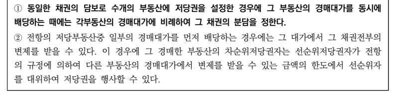 그러나 수 개의 부동산 중 일부는 채무자의 소유이고 일부는 물상보증인의 소유인 경우에는, 물상보증인이 제481조, 제482조의 규정에 의한 변제자대위에 의하여 채무자 소유의 부동산에 대하여 담보권을 행사할 수 있는 지위에 있는 점 등을 고려할 때, 채무자 소유의 부동산에 관한 피담보채권액은 공동저당권의 피담보채권액 전액으로 보는 것이 타당하다(대법원 2008. 4. 10. 선고 2007다78234 판결).
