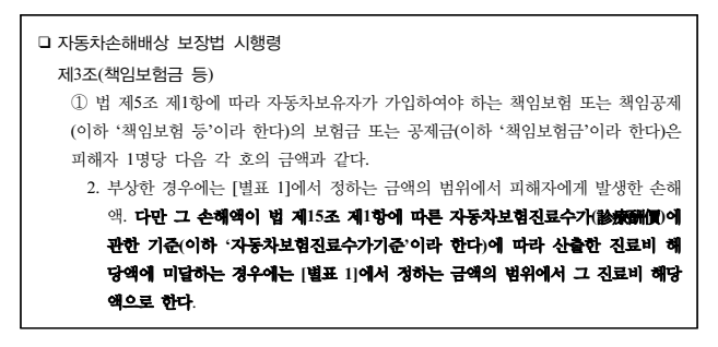 ⑴ 만약 가해자의 과실비율이 매우 적어 피해자의 ‘손해액’이 피해자의 ‘진료비’에 미달하는 경우, 보험자는 자배법상 책임보험금의 범위 내에 있는 피해자의 ‘진료비’를 피해자에게 보험금으로 지급하여야 한다(자배법 시행령 제3조 제1항 제2호 단서).