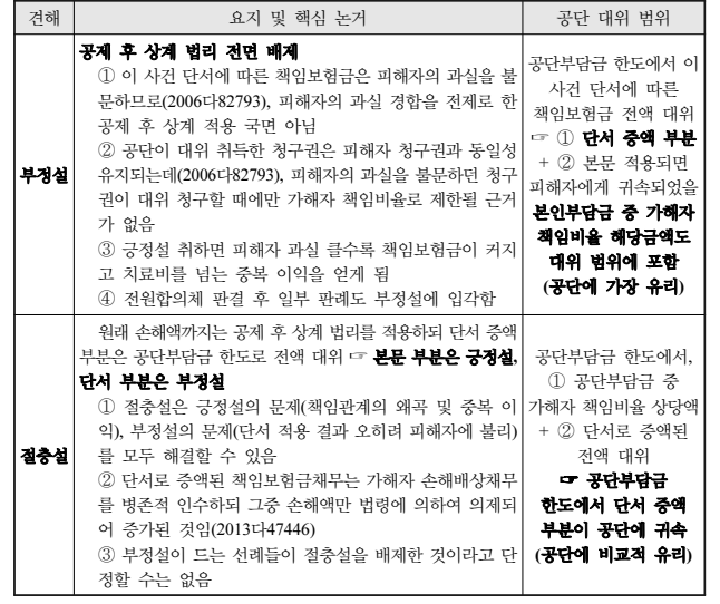 ⑴ 이 부분 쟁점은 앞서 살펴본 ‘행사상 우열관계’ 쟁점에 관하여 종전 ‘공단우선설’을 채택하고 있던 대법원 판례의 견해를 변경한다면, 더 나아가 살펴볼 필요성이 크지 아니한 사항이다.