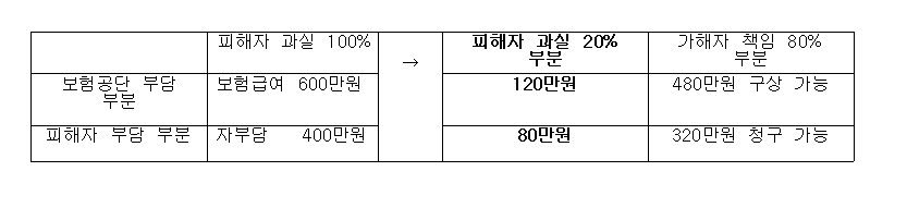 피해자가 손해배상을 청구하면 치료비 내역서에 나온 ‘자부담 부분’에 가해자의 과실비율을 곱하면 되고(320만 원 = 자부담 400만 원 × 가해자 과실비율 80%), 공단이 보험자대위로 구상권을 청구하면 ‘급여액’에 가해자의 과실비율을 곱하면 된다(480만 원 = 급여액 600 만 원 × 가해자 과실비율 80%).