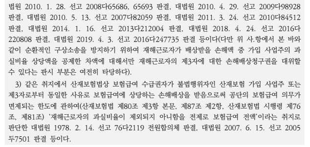 ㈑ 산재보험에 관한 대법원 판례도 피해자의 직접청구권보다 공단의 구상권 행사를 우선하는 ‘공단우선설’의 입장을 유지하여 온 것으로 보이고, 앞서 살펴본 건강보험에 관한 판례는 종전 산재보험에 관한 판례 법리를 차용한 것으로 여겨진다.