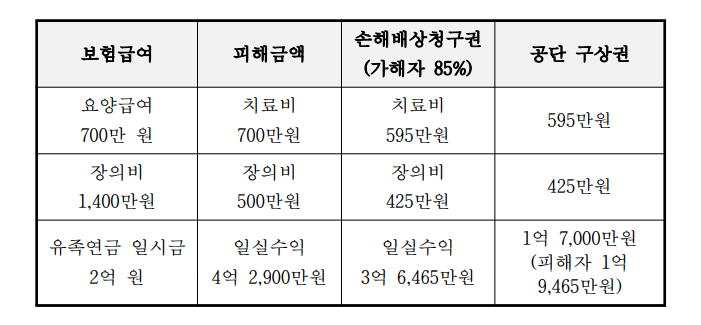 ⑶ 산정방식을 살펴보면, 가해자의 과실상계 후 손해배상액에서 보험자(공단)가 우선급여 범위 내에서 구상권 행사를 할 수 있고, 피해자는 이를 공제한 나머지 범위 내에서 가해자에 대해 손해배 상청구권을 행사할 수 있다.
