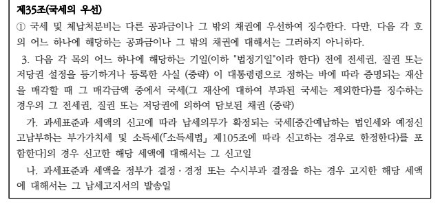 ⑶ 국세기본법 제35조는 2019년말 개정을 통해 법정기일 기술 방식 및 조항 위치 등이 일부 변경되었지만, 그 기본적인 내용은 동일함