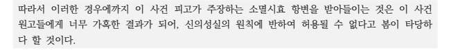 다만 실정법에 정하여진 개별 법제도의 구체적 내용에 좇아 판단되는 바를 신의칙과 같은 일반조항에 의한 법원칙을 들어 배제 또는 제한하는 것은 중요한 법가치의 하나인 법적 안정성을 후퇴시킬 우려가 있다. 특히 소멸시효 제도는 법률관계 주장에 일정한 시간적 한계를 설정함으로써 그에 관한 당사자 사이의 다툼을 종식시키려는 것으로서, 누구에게나 무차별적ㆍ객관적으로 적용되는 시간의 경과가 1차적인 의미를 가지는 것으로 설계되었음을 고려하면, 법적 안정성 요구는 더욱 선명하게 제기된다. 따라서 소멸시효 완성 주장이 신의성실 원칙에 반하여 허용되지 아니한다고 평가하는 것은 신중을 기할 필요가 있다(대법원 2005. 5. 13. 선고 2004다71881 판결, 대법원 2016. 9. 30. 선고 2016다218713, 218720 판결 등 참조).