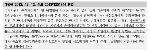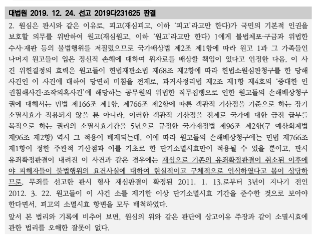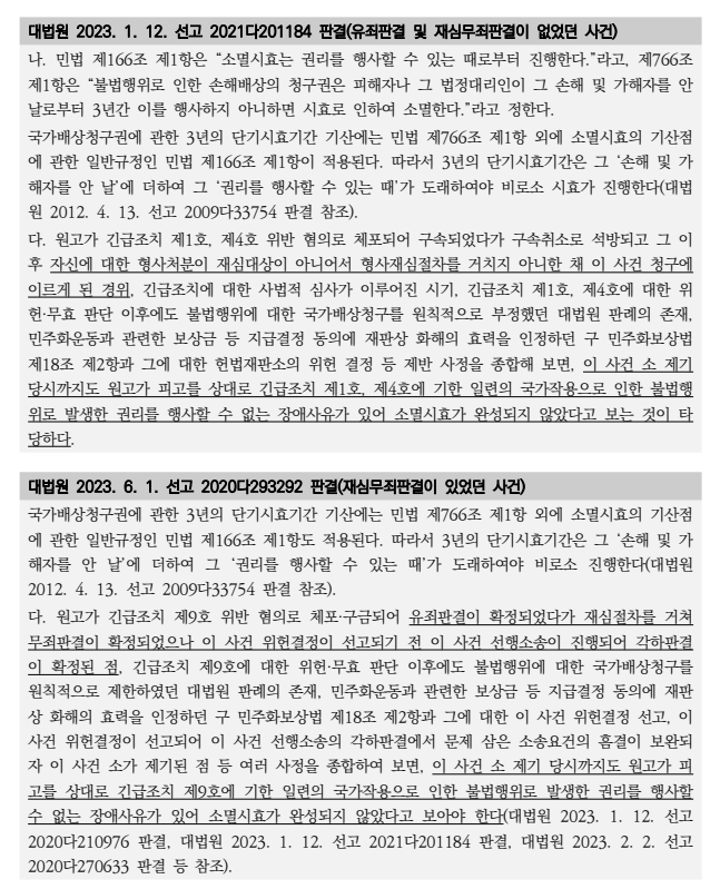 - [2018년 위헌결정 이후] 헌법재판소의 위헌결정에 따라 일정한 유형의 과거사 사건에는 장기소 멸시효가 적용되지 않게 되었음(헌법재판소 2018. 8. 30. 선고 2014헌바148 결정, 대법원 2019. 11. 14. 선고 2018다233686 판결) ⇒ 따라서 장기소멸시효 완성과 그 시효 주장이 신 의칙에 위반되는지, 장애가 해소된 때로부터 어느 기간 내에 권리를 행사하여야 하는지는 더 이상 문제되지 않게 되었고, 민법 제766조 제1항의 단기소멸시효만이 문제되는데, 판례는 재심무죄판결 확정일을 단기소멸시효의 기산점으로 봄(대법원 2019. 12. 24. 선고 2019다231625 판결, 대법원 2020. 2. 27. 선고 2019다232284 판결 등) ⇒ 재심무죄판결 확정일로부터 3년이 지나기 전에 권리를 행사하면 되는 것임(대법원 2019. 12. 24. 선고 2019다231625 판결)