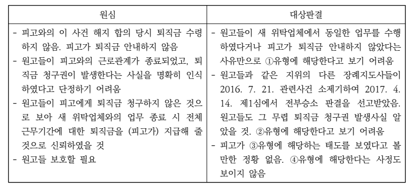 ⑶ 피고가 장례의전 업무를 주식회사 A(이하 ‘A회사’)에 위탁하기로 함에 따라, 장례지도사인 원고들은 피고와 의전대행 위탁계약을 해지하기로 합의하였음(이하 ‘이 사건 해지합의’). 원고들은 같은 날 A회사와 의전대행 위탁계약을 체결하고 퇴직할 때까지 의전팀장으로 장례의전대행 업무를 수행하였는데, 원고들이 피고를 상대로 피고와 A회사에서 근무한 전체 기간 또는 피고에서 근무한 기간에 대한 퇴직금 등을 청구하자, 피고가 원고들의 퇴직금 청구권의 소멸시효가 완성되었다고 주장한 사안임