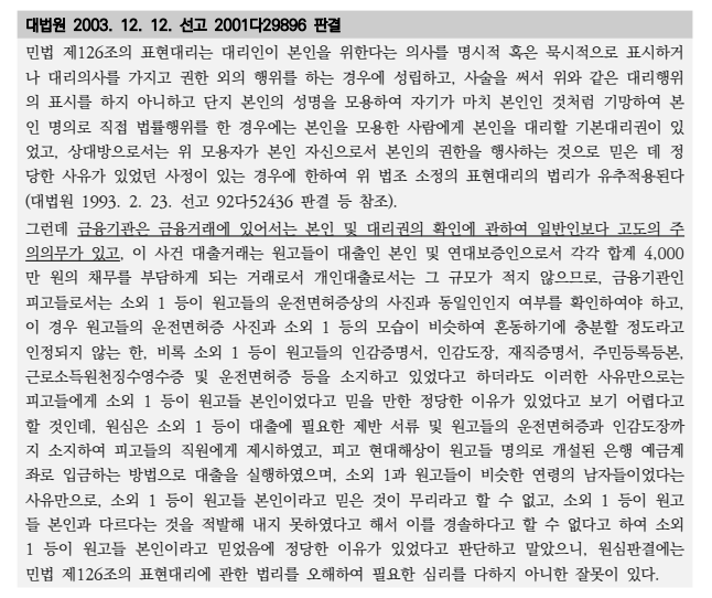 ⑿ 그러나 한 가지 유의해야 할 점은, 이 사건처럼 금융기관이나 여신전문금융회사 등이 표현대리를 주장하는 경우, 판례는 정당한 이유를 거의 인정하지 않는다는 것임. 위에서 본 대법원 2003. 12. 12. 선고 2001다29896 판결에서도 이 점을 명시적으로 밝히고 있음