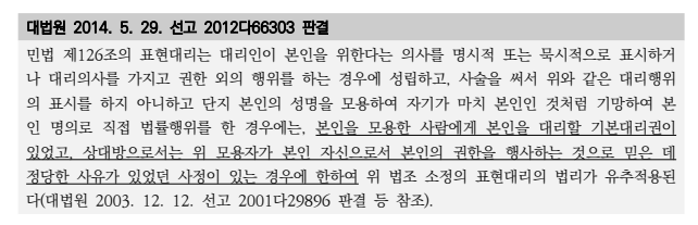 ⑹ 대리행위가 표시되지 않고 대리인에 의해 본인 명의로 법률행위가 이루어진 경우 표현대리의 성립에 관한 판례 (대법원 2014. 5. 29. 선고 2012다66303 판결)