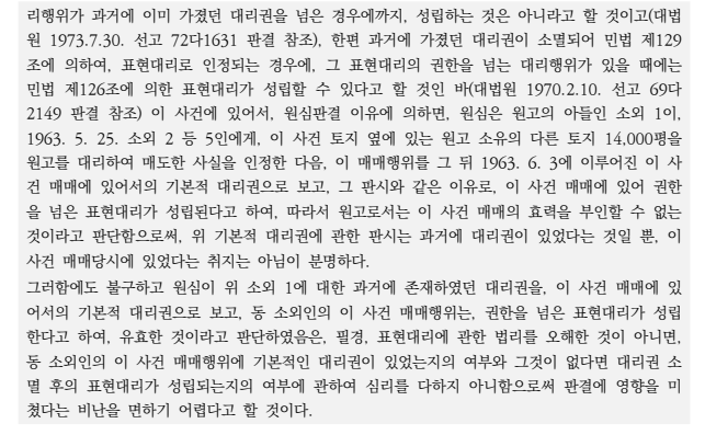 - 원심이 본인 명의로 직접 법률행위를 한 경우 ‘특별한 사정이 없는 한’ 민법 제126조의 표현대리가 성립될 수 없다고 판시하기는 하였으나, ‘특별한 사정’에 관하여는 구체적 내용을 설명하지 않음