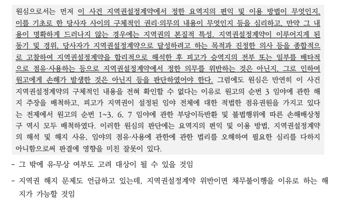 ⑹ 대법원은, 지역권자가 지역권설정계약에서 정한 의무를 위반하였다고 주장하는 경우 먼저 이 사건 지역권설정계약에서 정한 요역지의 편익 및 이용 방법이 무엇인지, 이를 기초로 한 당사자 사이의 구체적인 권리ㆍ의무의 내용이 무엇인지 등을 심리하고, 만약 그 내용이 명확하게 드러나지 않는 경우에는 지역권의 본질적 특성, 지역권설정계약이 이루어지게 된 동기 및 경위, 당사자가 지역권설정계약으로 달성하려고 하는 목적과 진정한 의사 등을 종합적으로 고찰하여 지역권설정계약을 합리적으로 해석한 후 피고가 승역지의 전부 또는 일부를 배타적으로 점유ㆍ사용하는 등으로 지역권설정계약에서 정한 의무를 위반하는 것은 아닌지, 그로 인하여 원고에게 손해가 발생한 것은 아닌지 등을 판단하였어야 한다고 보아, 이와 달리 판단한 원심을 파기ㆍ환송함