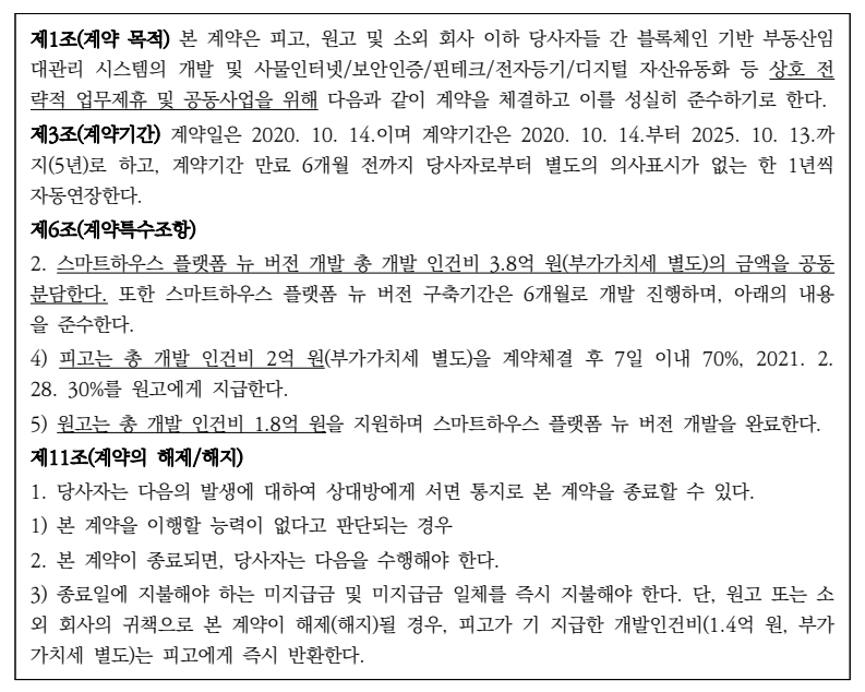 ⑹ 이 사건에서 2020. 10. 14. 계약이 체결되고 그 무렵 피고로부터 원고에게 1억 4,000만 원이 지급되었는데, 그 후 원고가 2021. 2. 10. 계약해지를 통보할 때까지 당초 계획한 스마트하우스 플랫폼 뉴 버전 개발이 지지부진하고 특별히 사업이 진행된 것이 없는 것으로 보임(원고 측에 뉴 버전 개발을 위한 인력 투입 등 일정 정도 비용이 발생하였을 수는 있음). 그렇다면 어느 한 조합원이 탈퇴하든 해산에 따라 잔여재산을 분배하든 간에 피고로부터 원고에게 지급된 1억 4,000만 원을 정리 내지 정산할 필요가 있어 보임