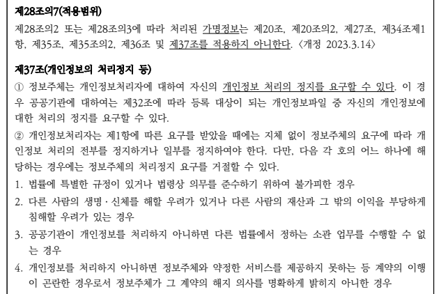 ⑴ ‘가명정보를 처리하는 것’은 개인정보 보호법 제28조의2에 따라 정보주체의 동의 없이 가능하고, 제28조의7에서도 가명정보에 대해서는 제37조의 적용을 배제하고 있으므로, 정보주체가 (이미 가명처리된) 가명정보에 대하여 정보 처리의 정지를 요구할 수 없음은 분명함