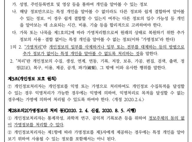 ⑶ “가명처리”는 그 개념적 정의에 의하더라도 개인정보에 대한 식별의 위험성을 낮추는 방법이므로, 정보주체에 대한 권리 또는 사생활 침해의 위험을 발생시킬 수 있는 「개인정보 보호법」 제2조 제2호에서 규정한 여러 유형의 개인정보 “처리”와는 구별된다. 같은 법 제3조 제7항에서 “개인정보처리자는 개인정보를 익명 또는 가명으로 처리하여도 개인정보 수집목적을 달성할 수 있는 경우 익명처리가 가능한 경우에는 익명에 의하여, 익명처리로 목적을 달성할 수 없는 경우에는 가명에 의하여 처리될 수 있도록 하여야 한다.”라고 규정한 것은 가명처리를 익명처리에 준하는 개인정보 보호조치로 분류한 것으로 볼 수 있다. 또한 “가명처리”는 더 이상의 처리가 가능하지 않도록 개인정보 자체를 삭제하거나 파쇄 또는 소각하는 개인정보의 파기와도 개념적으로 구분이 되는 행위이다.
